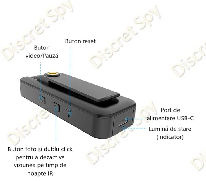 - Fixare: clemă / prindere tip clip pentru purtare.