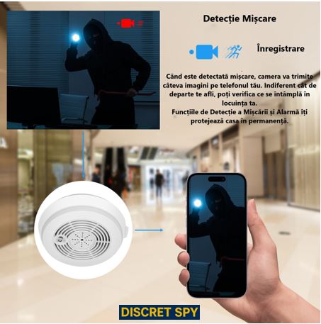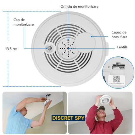 Cameră de supraveghere perfect camuflată, integrată într-un detector de fum fals – ideală pentru monitorizare discretă în locuințe, birouri, recepții sau orice spațiu unde nu vrei ca aparatura să fie vizibilă.